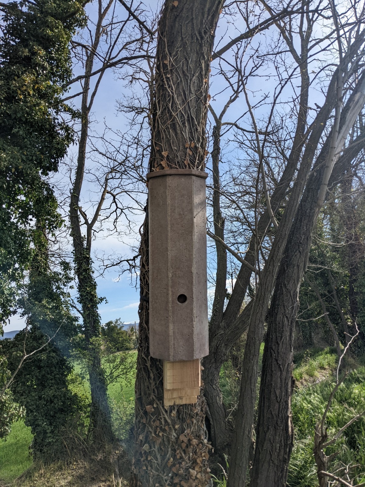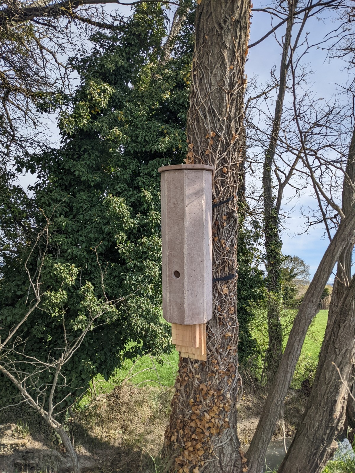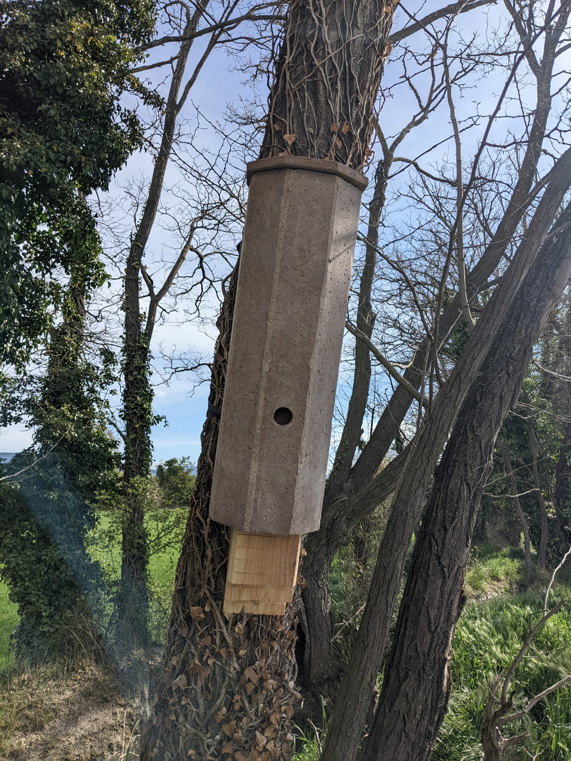 Le nichoir en béton de bois ne nécessite ni entretien ni nettoyage. Comme le nichoir en béton de bois est ouvert à la base, les excréments peuvent tomber directement sur le sol. Il est cependant possible d’effectuer un contrôle grâce au toit amovible du nichoir en béton de bois, mais pas avant le mois d’octobre car c’est à la fin de l’été que la plupart des chauves-souris quittent leur abri.