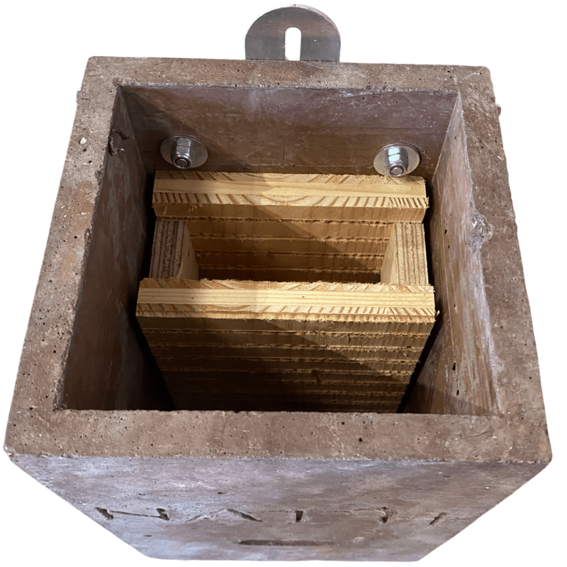Le nichoir en béton de bois ne nécessite ni entretien ni nettoyage. Comme le nichoir en béton de bois est ouvert à la base, les excréments peuvent tomber directement sur le sol. Il est cependant possible d’effectuer un contrôle grâce à la partie supérieure du nichoir en béton de bois qui est amovible, mais pas avant le mois d’octobre car c’est à la fin de l’été que la plupart des chauves-souris quittent leur abri.